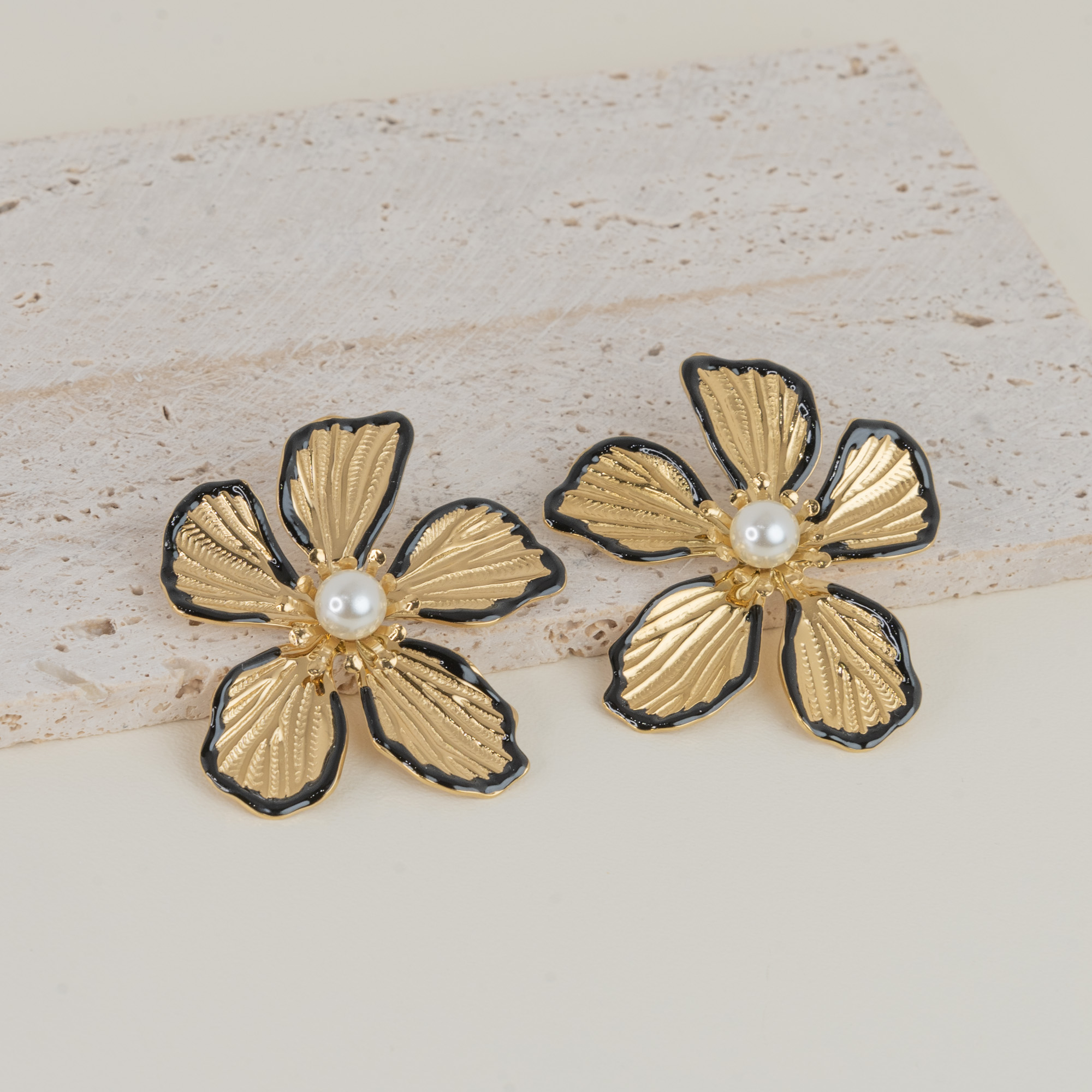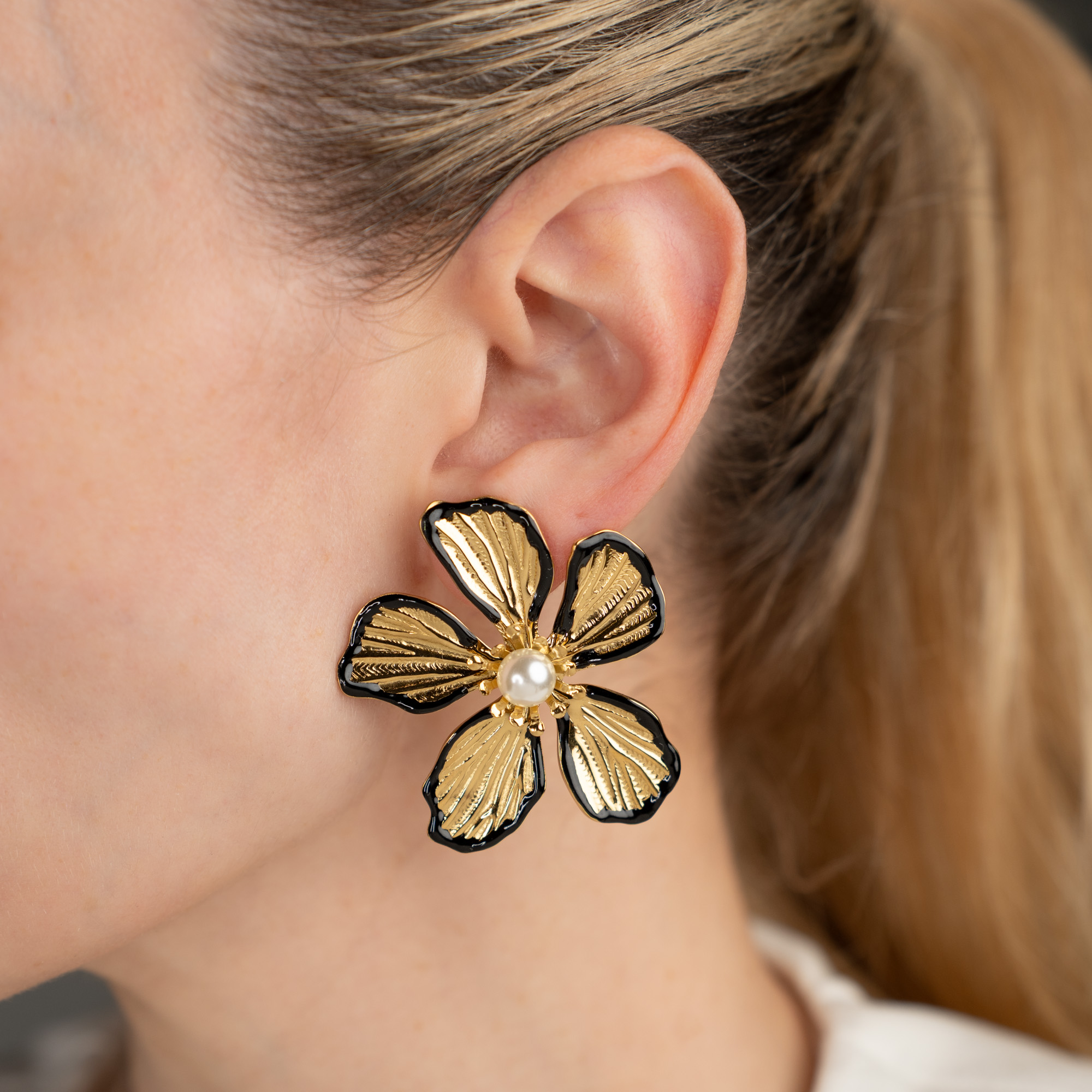 Anthea Black Gold ατσάλινα σκουλαρίκια λουλούδι με ανάγλυφο σχέδιο και πέρλα στο κέντρο