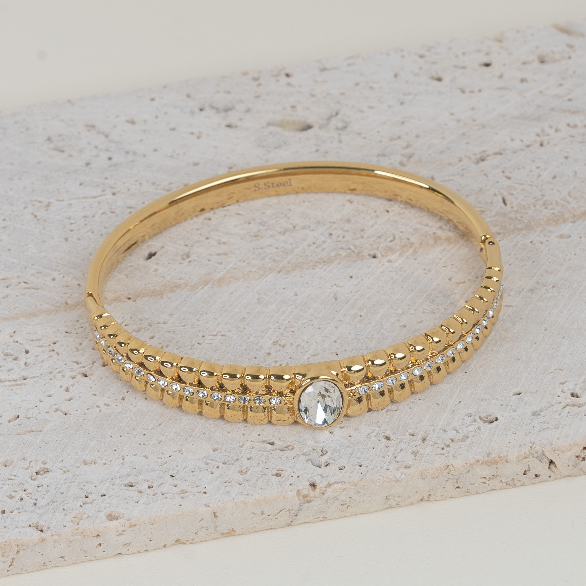 Marcella Gold Ατσάλινο βραχιόλι χειροπέδα με λευκά ζιργκόν