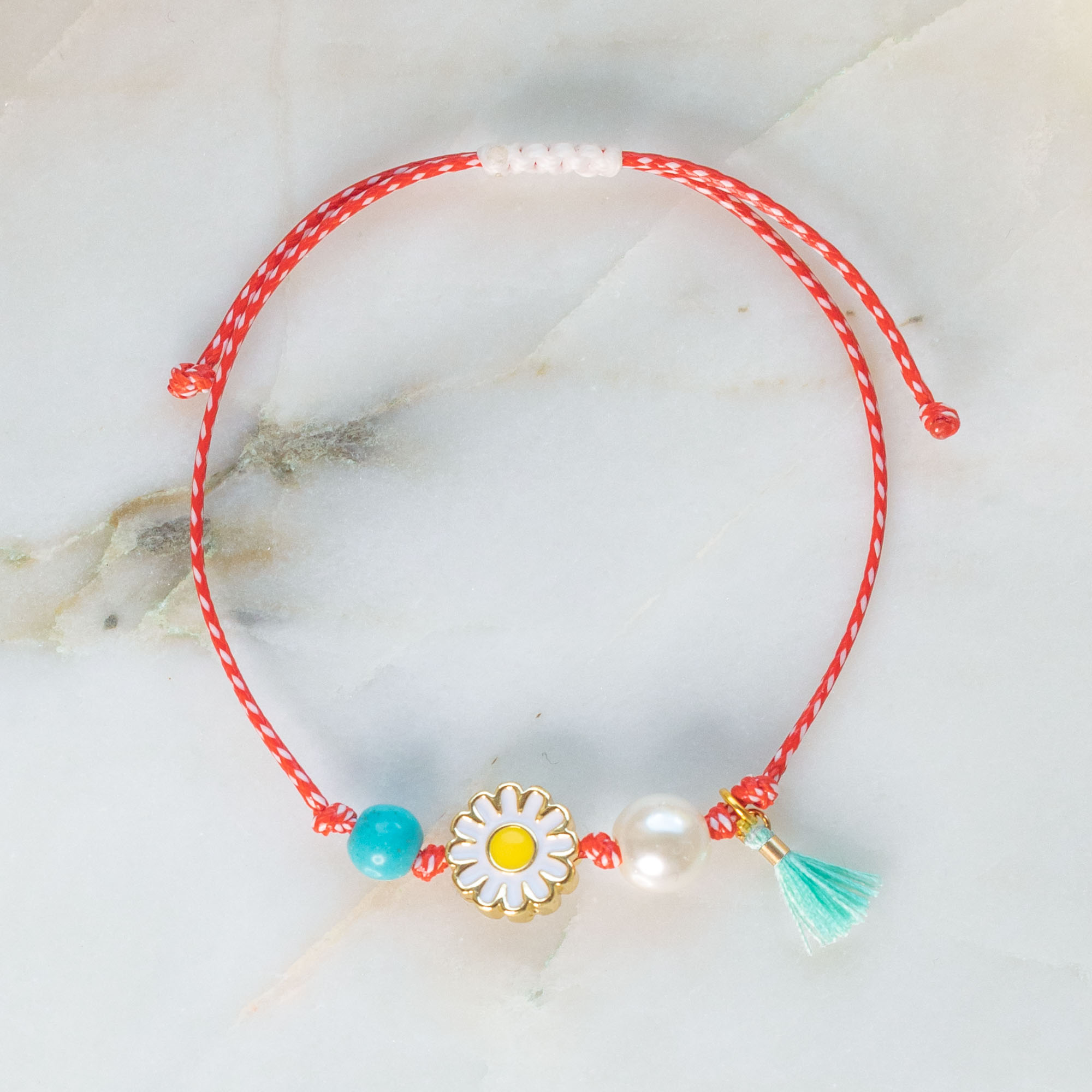 Χειροποίητο Βραχιόλι Μαρτάκι με κόκκινο-λευκό κορδόνι, ορειχάλκινα στοιχεία, χάντρες και κούμπωμα μακραμέ με δυνατότητα αυξομείωσης