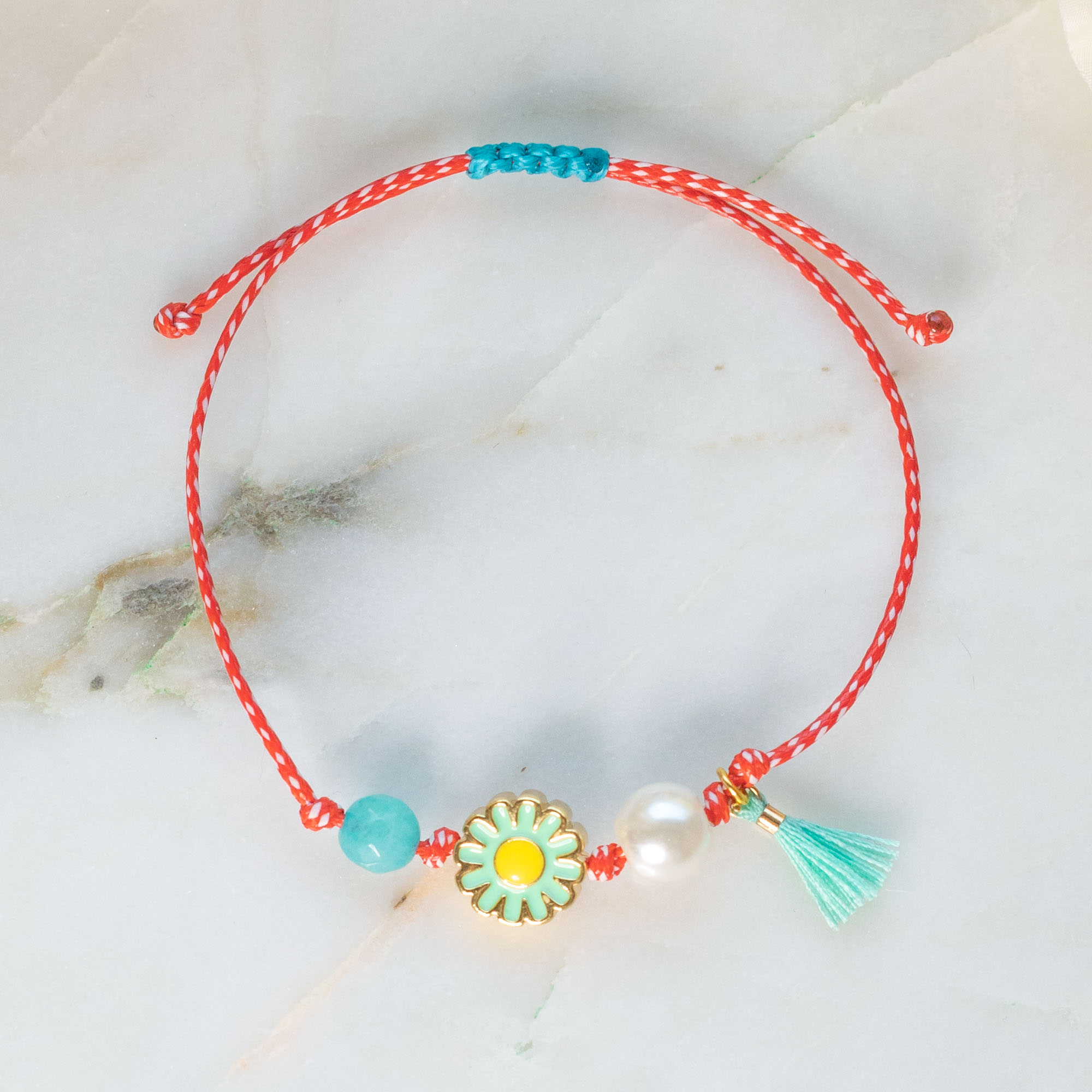 Χειροποίητο Βραχιόλι Μαρτάκι με κόκκινο-λευκό κορδόνι, ορειχάλκινα στοιχεία, χάντρες και κούμπωμα μακραμέ με δυνατότητα αυξομείωσης