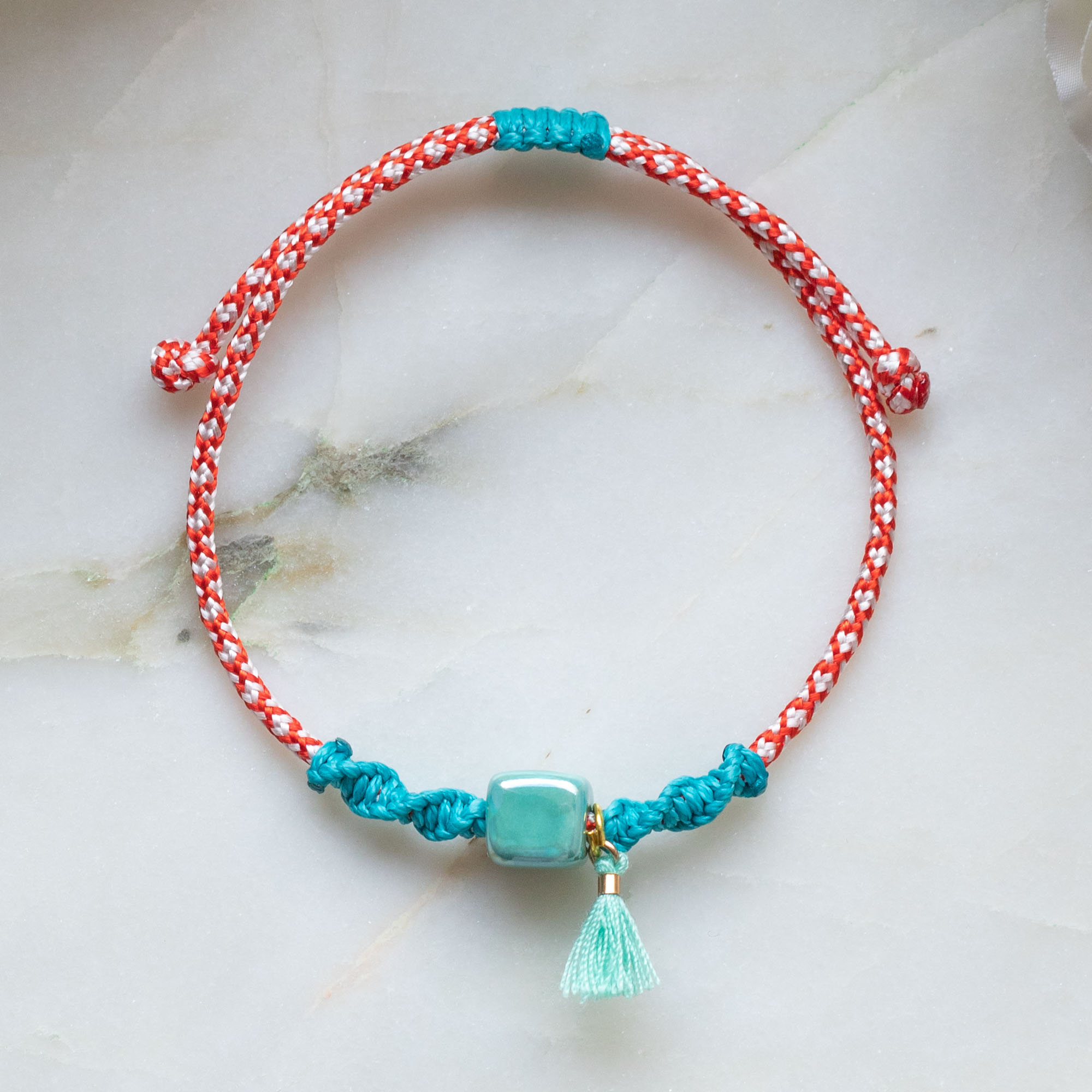 Χειροποίητο Βραχιόλι Μαρτάκι με κόκκινο-λευκό κορδόνι, κεραμική χάντρα και κούμπωμα μακραμέ με δυνατότητα αυξομείωσης