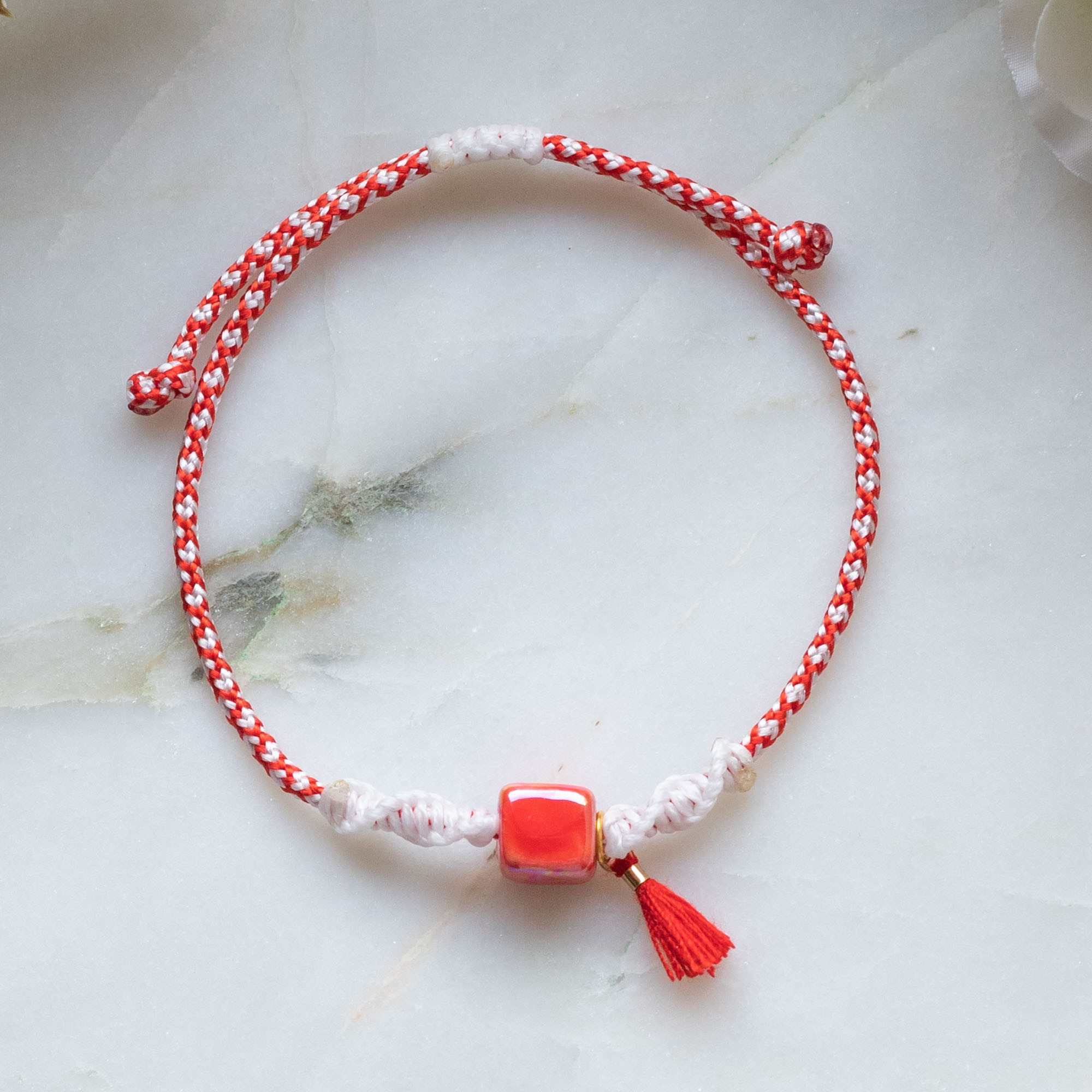 Χειροποίητο Βραχιόλι Μαρτάκι με κόκκινο-λευκό κορδόνι, κεραμική χάντρα και κούμπωμα μακραμέ με δυνατότητα αυξομείωσης
