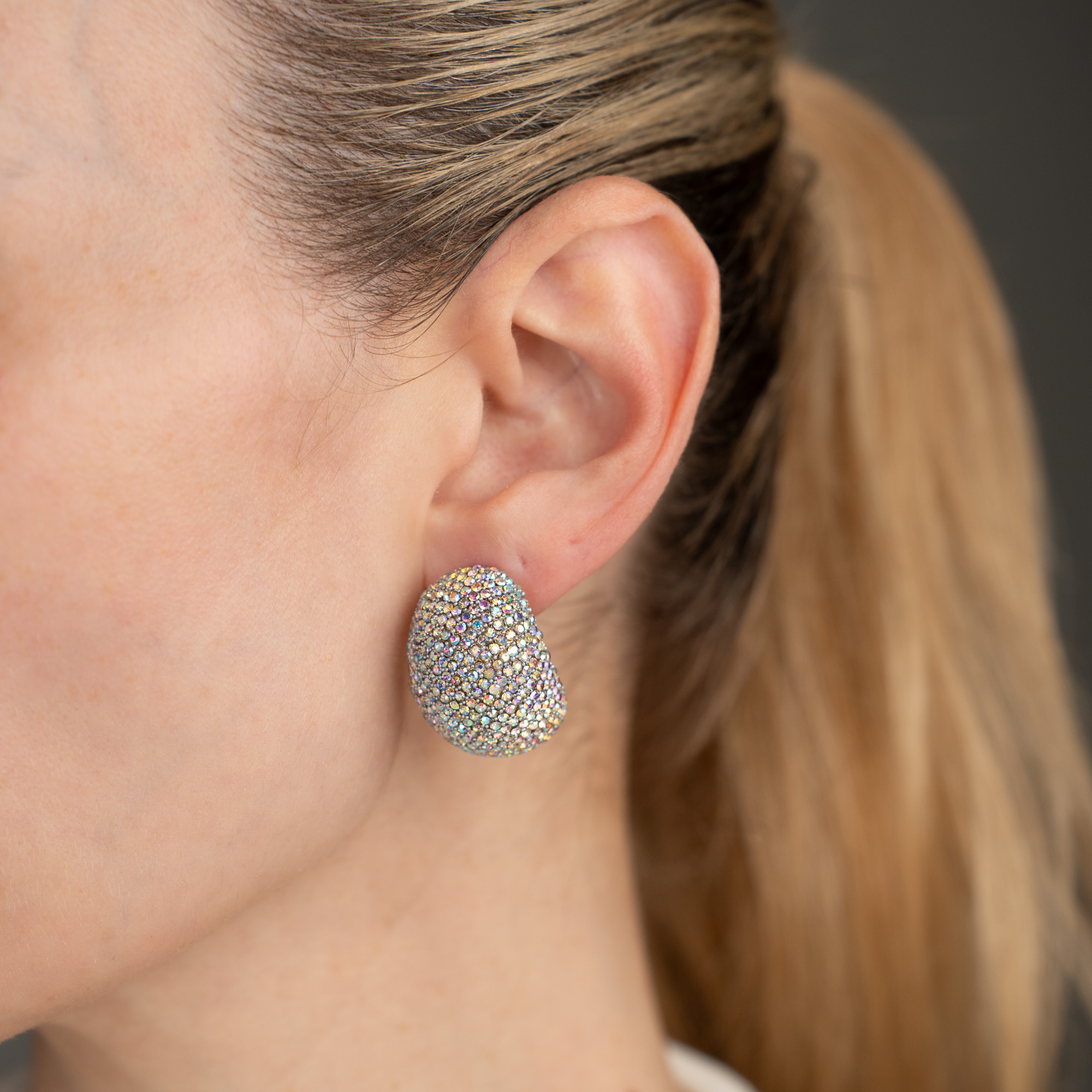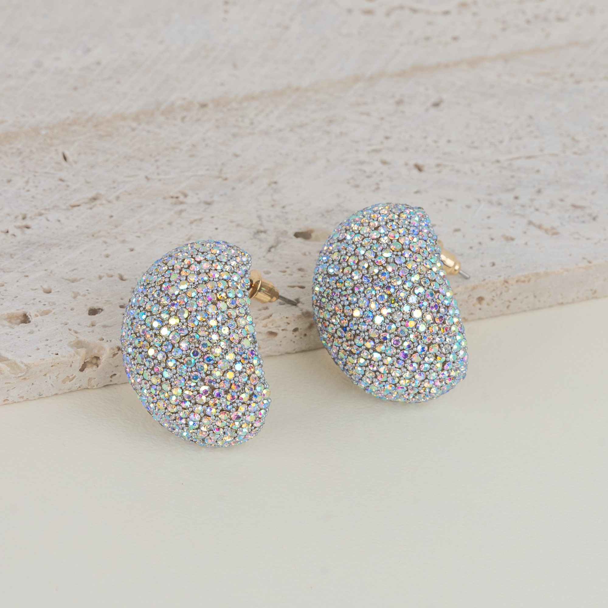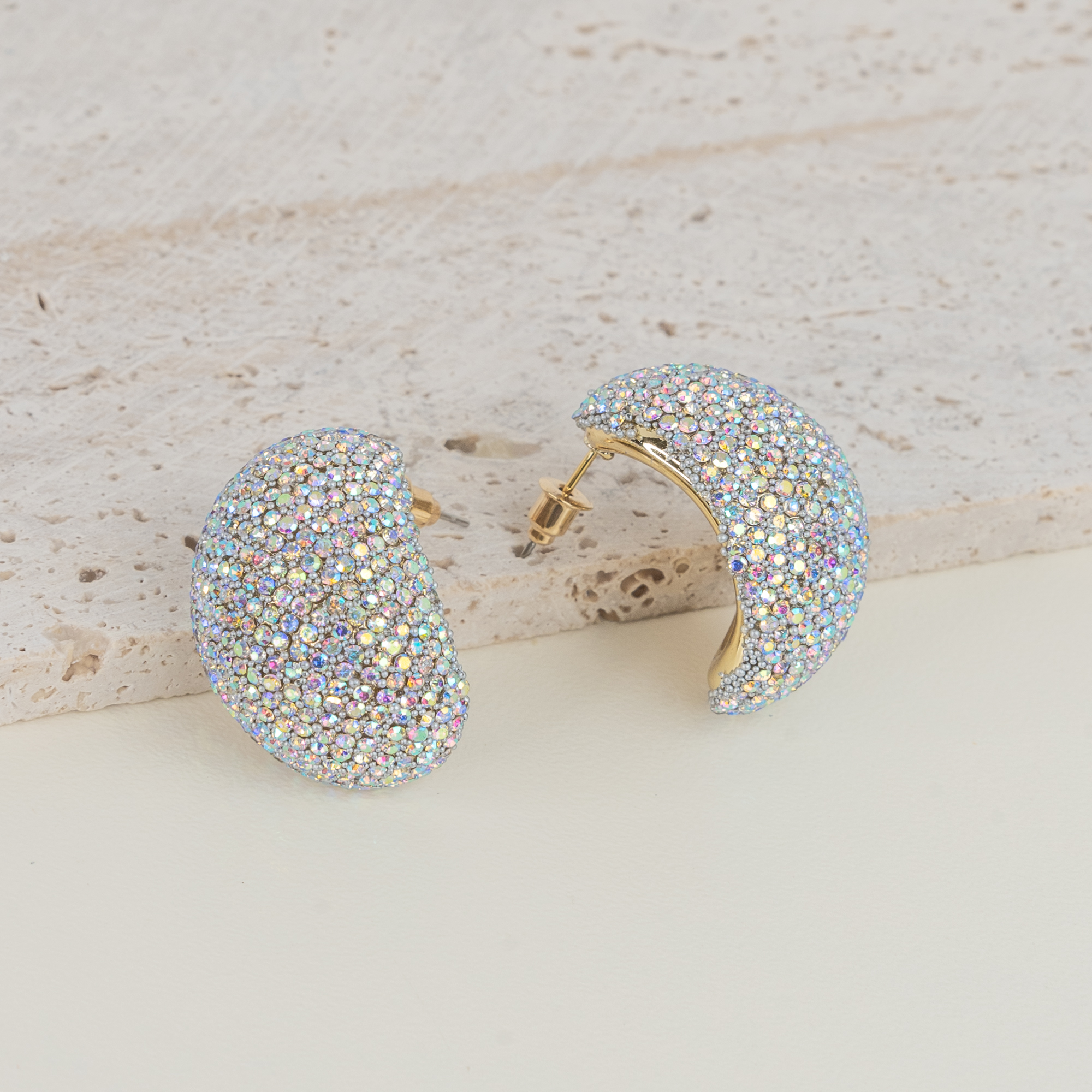 Stellar White Gold Ατσάλινα statement σκουλαρίκια μισοφέγγαρα, καλυμμένα εξολοκλήρου με λαμπερά κρυσταλλάκια σε ιριδίζον φινίρισμα