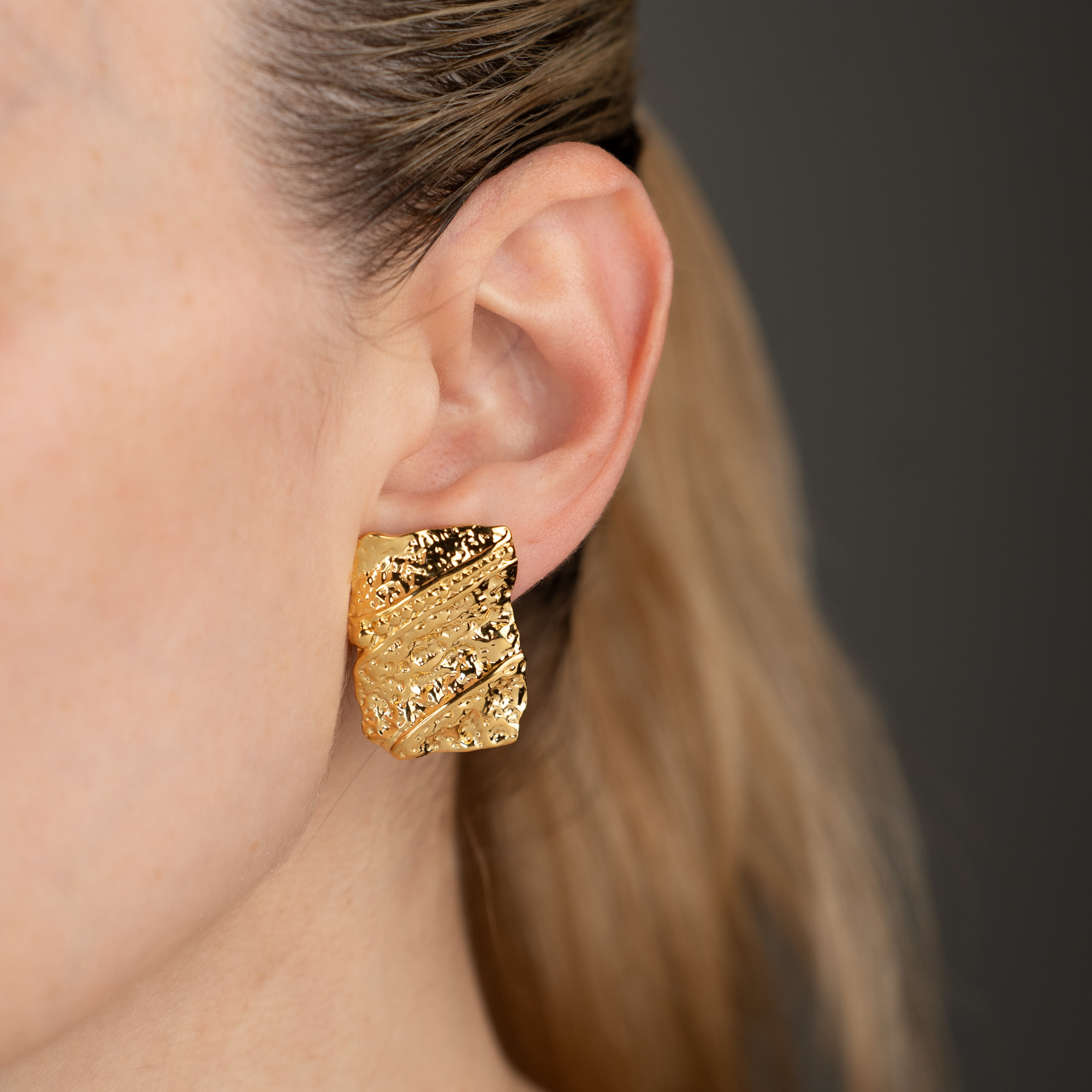 Vague Gold ατσάλινα ορθογώνια σκουλαρίκια με ανάγλυφη επιφάνεια και σφυρήλατο φινίρισμα