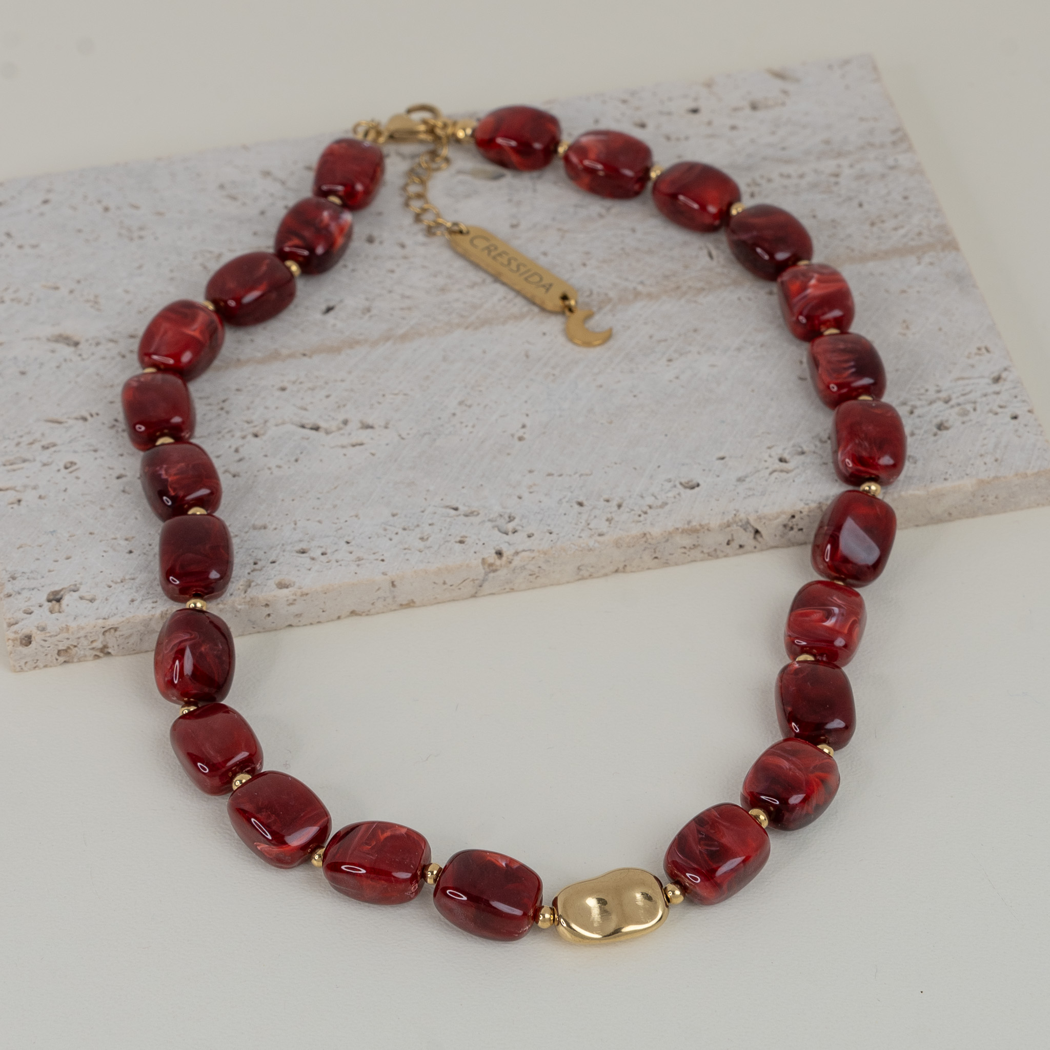 Velvet Red Gold Κολιέ με μπορντό οβάλ χάντρες και χρυσές ατσάλινες λεπτομέρειες